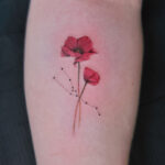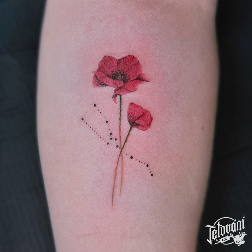 Tetování květiny, vlčí mák, souhvězdí býka na lýtko