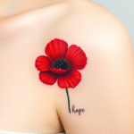Tetování květiny, vlčí mák, symbol naděje a nápis na rameno