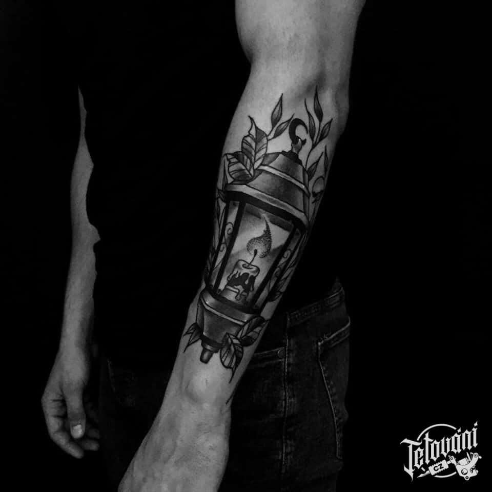 Tetování květiny, živel oheň, symbol lucerna se svičkou na předloktí