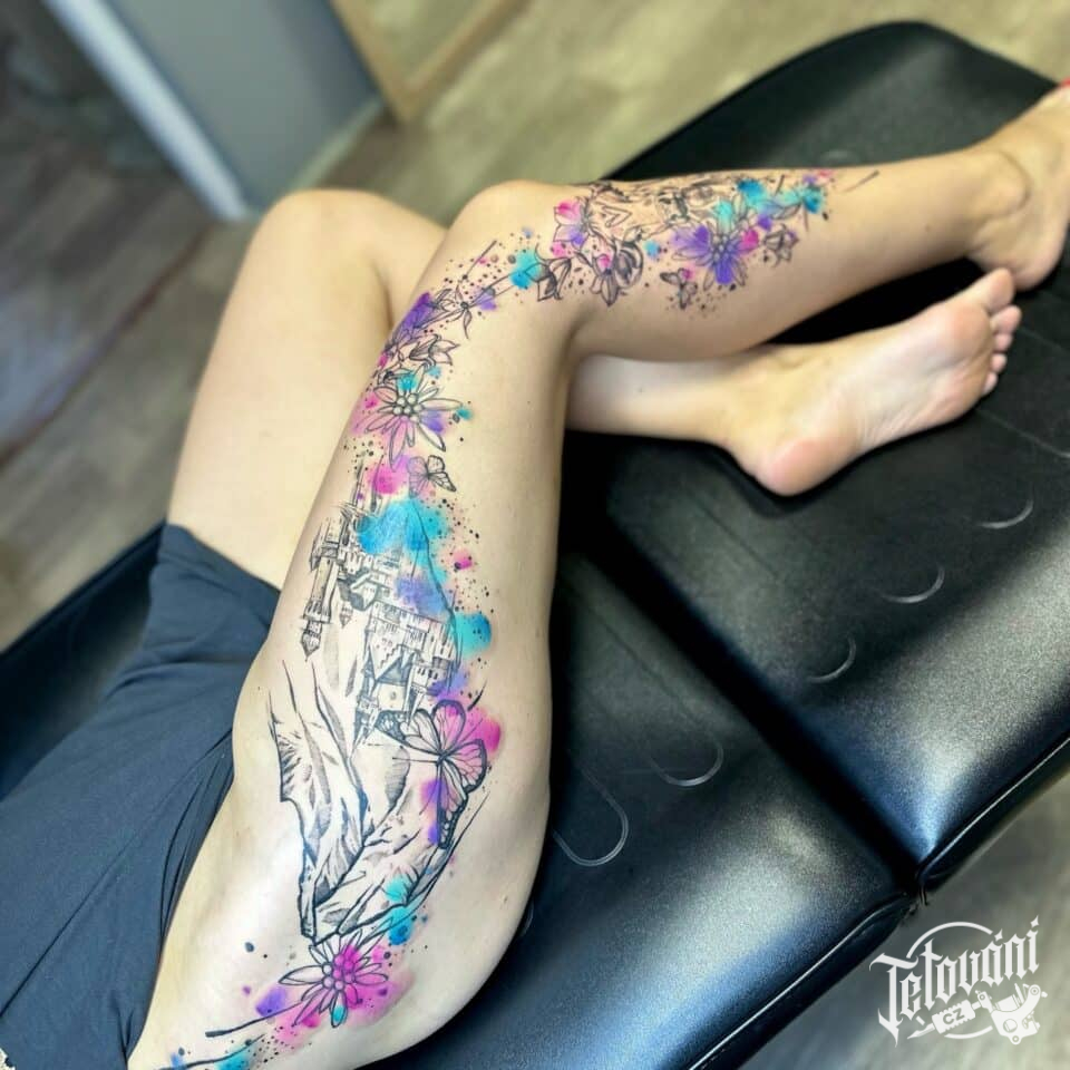 Tetování květiny, zvířata motýl na bok stehna