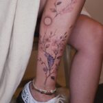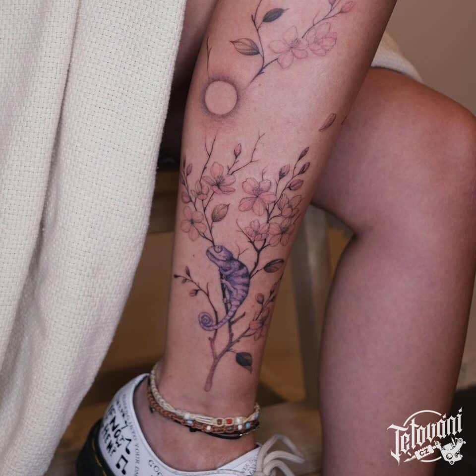 Tetování květiny, zvíře chameleon, měsíc na holeň