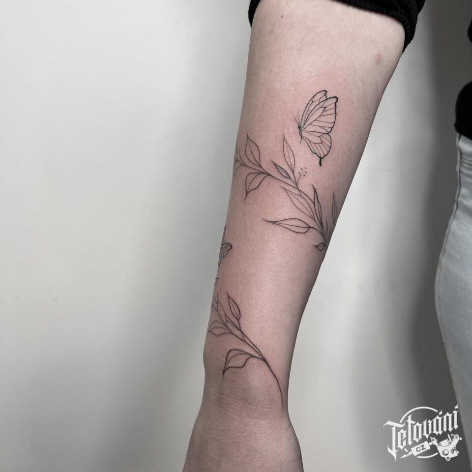 Tetování květiny, zvíře, motýlek na předloktí