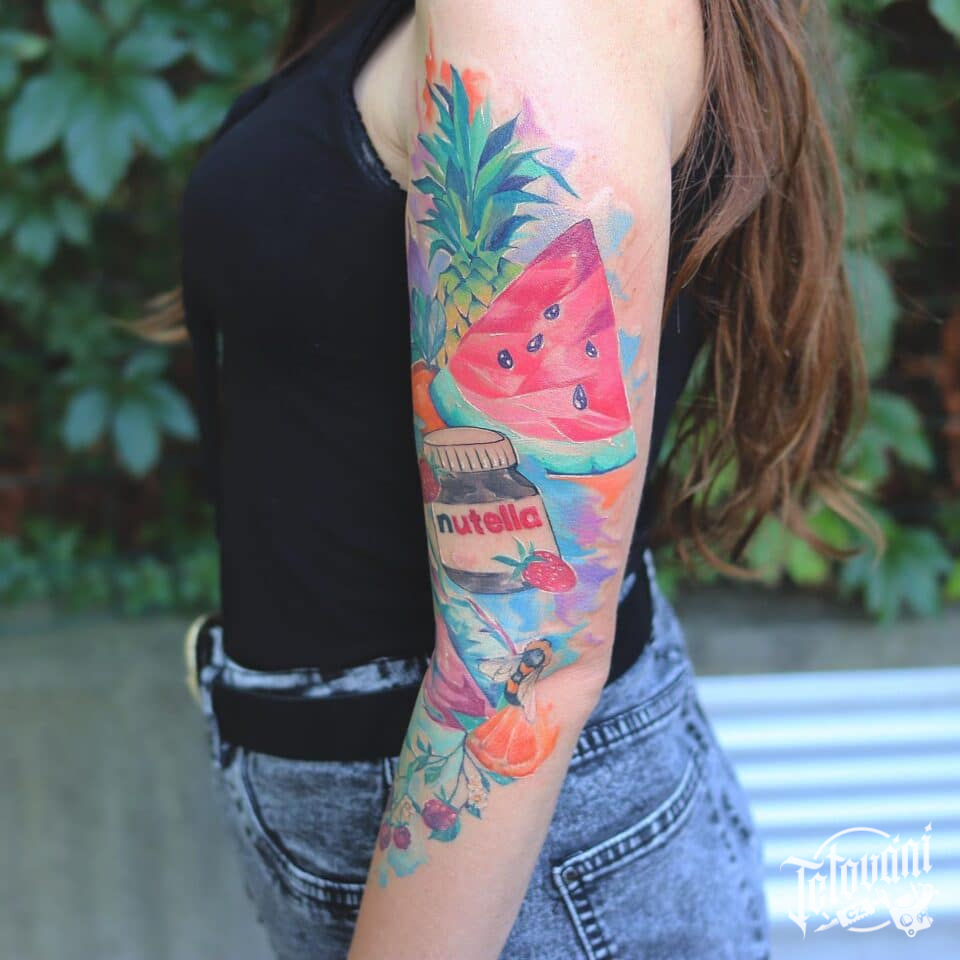 Tetování květiny, symboly zdraví ovoce a Nuttela na ruku