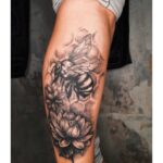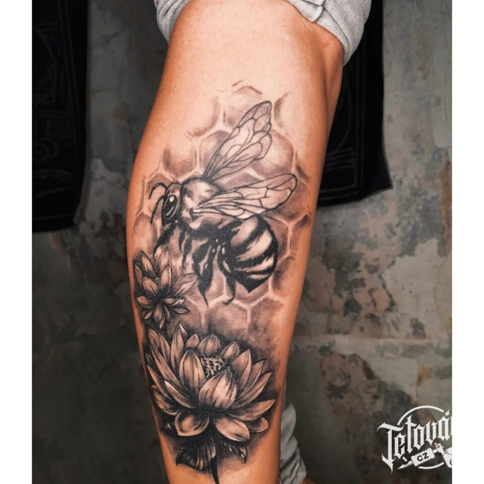 Tetování květiny, zvíře včela na lýtko