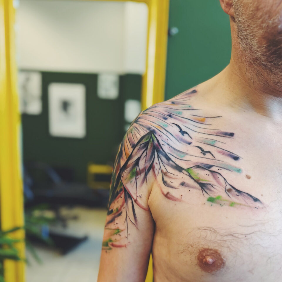 Tetování květiny, zvíře vlaštovky na rameno