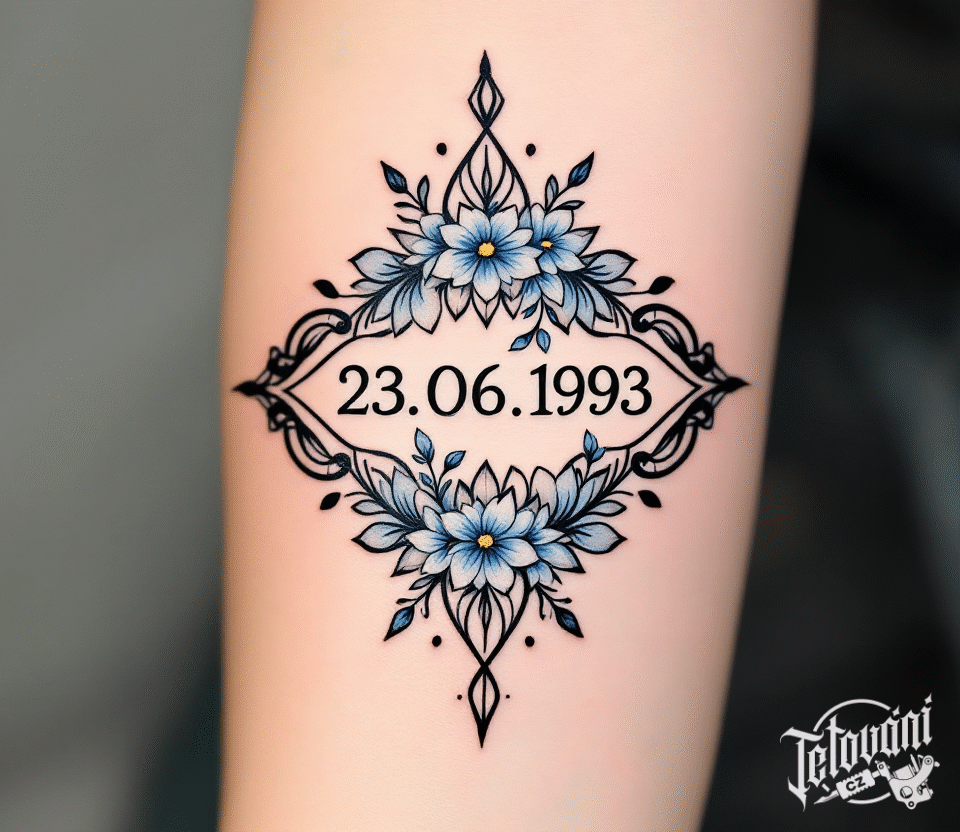 Tetování květy s nápisem, datum narození na předloktí