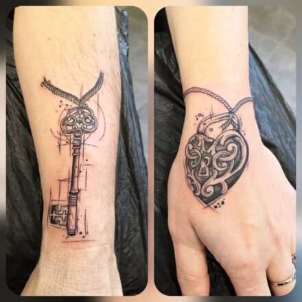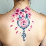 Tetování květy, zámek s klíčem na záda