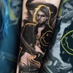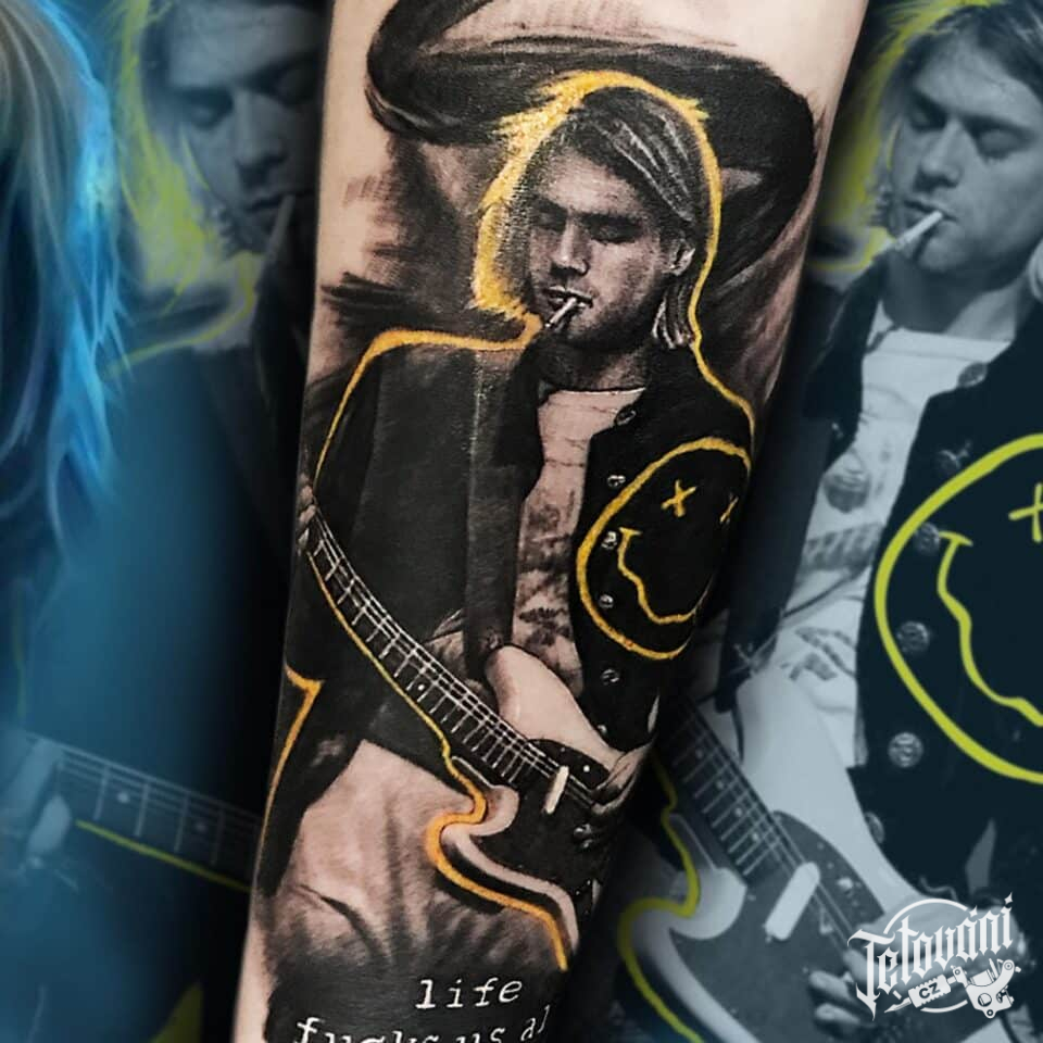 Tetování kytara, hudba, osobnost Kurt Cobain na předloktí