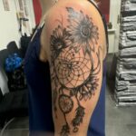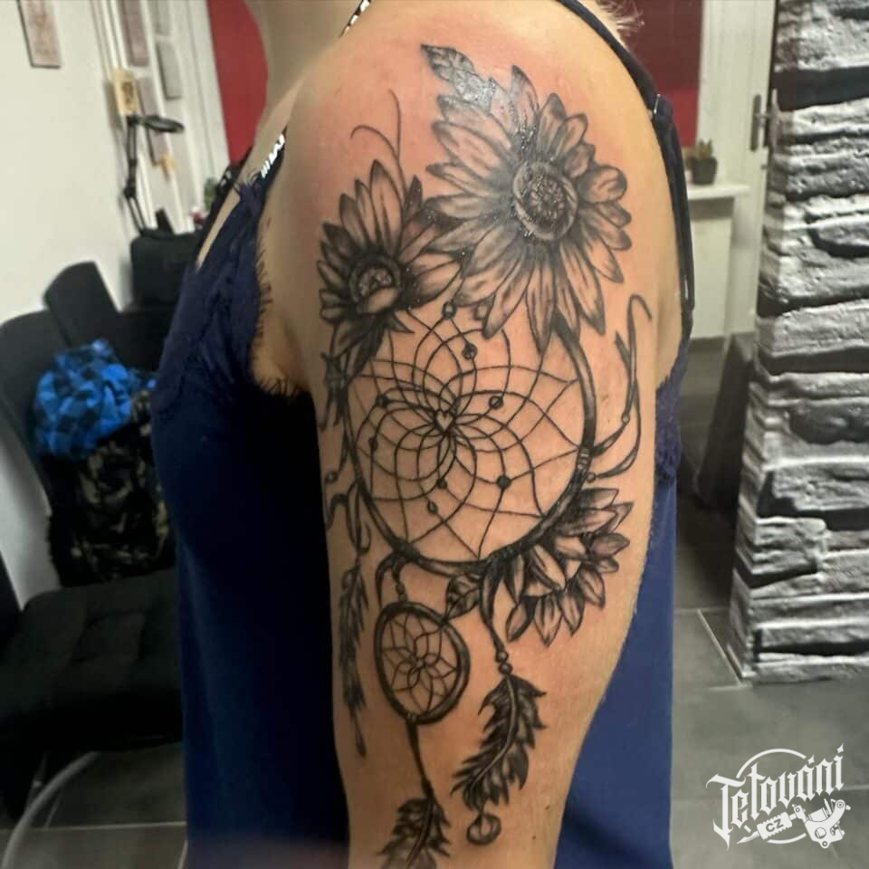 Tetování lapač snů, květiny, slunečnice na rameno