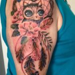 Tetování lapač snů s pírky a květy a zvíře na rameno
