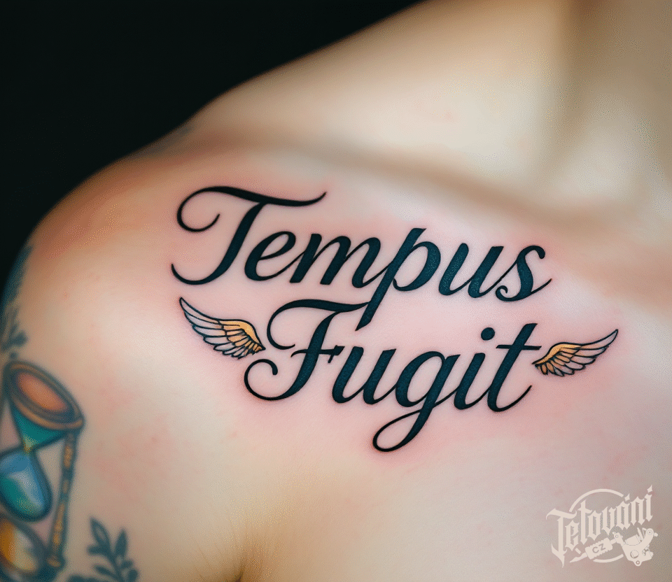 Tetování latinský citát s křídly pod klíční kostí