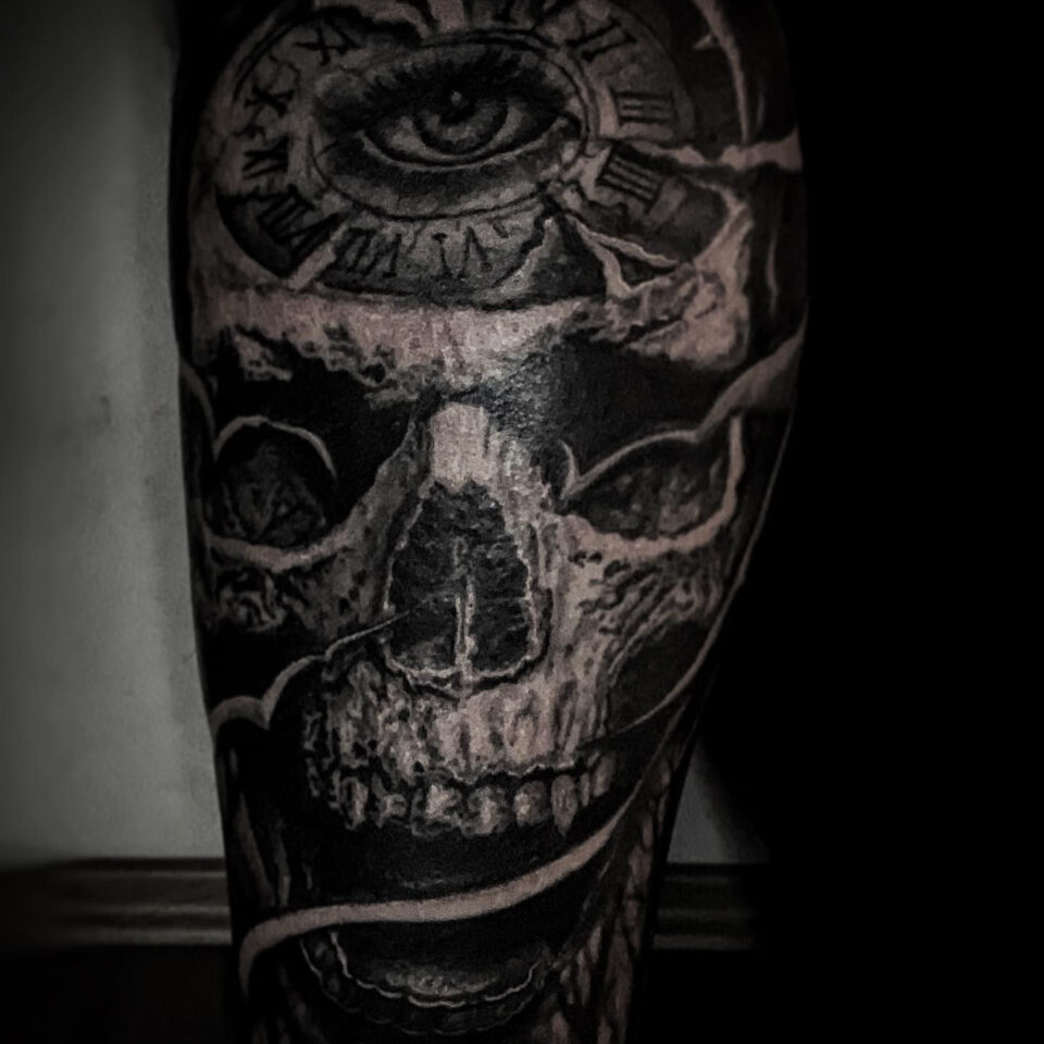 Tetování lebka a hodiny, oko na lýtku