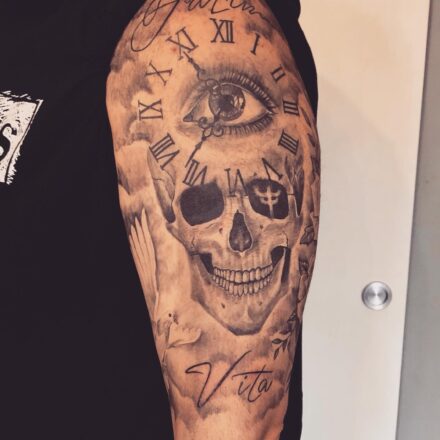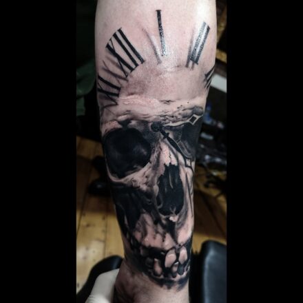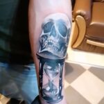 Tetování lebka a hodiny přesýpací na předloktí