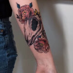 Tetování lebka a květiny na předloktí