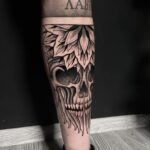 Tetování lebka a listy stromu na lýtko