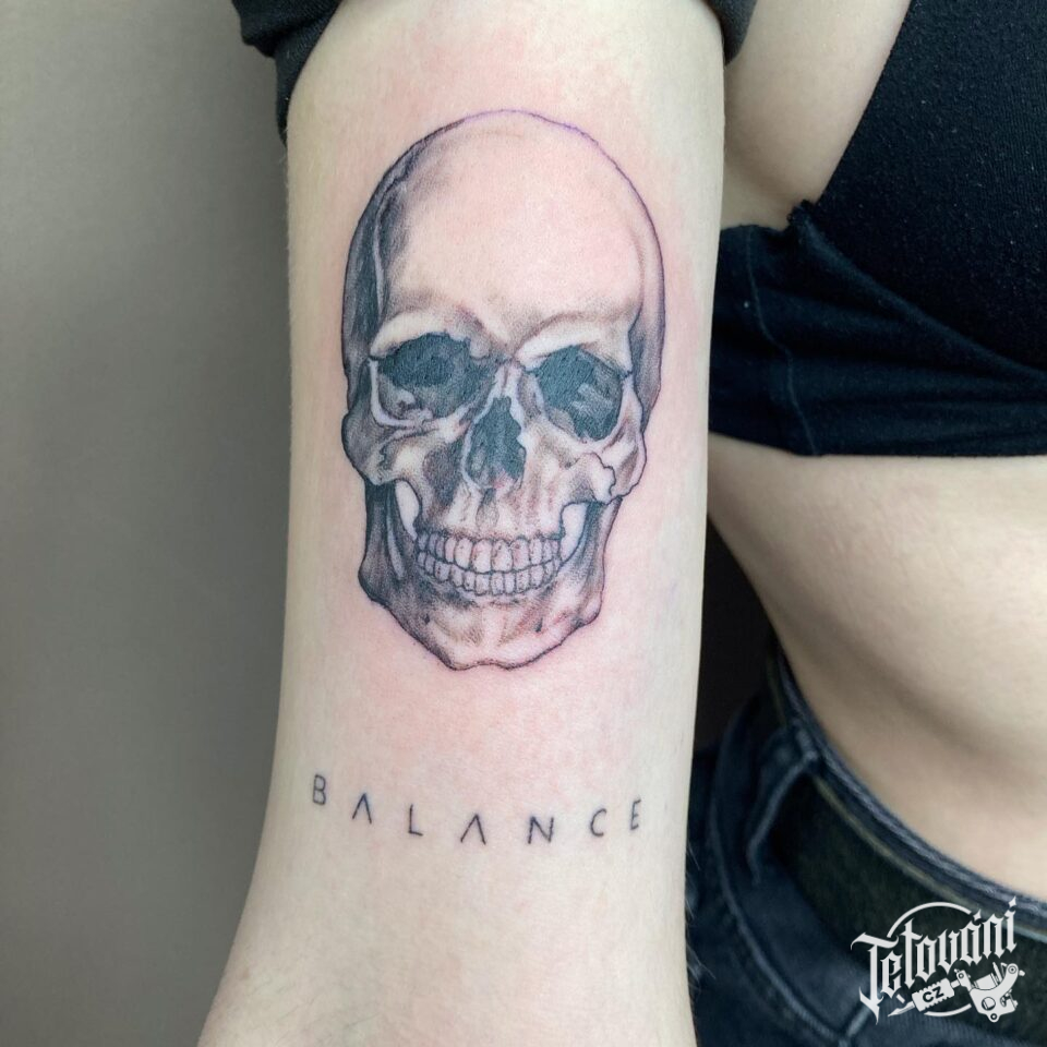 Tetování lebka a nápis na paži