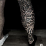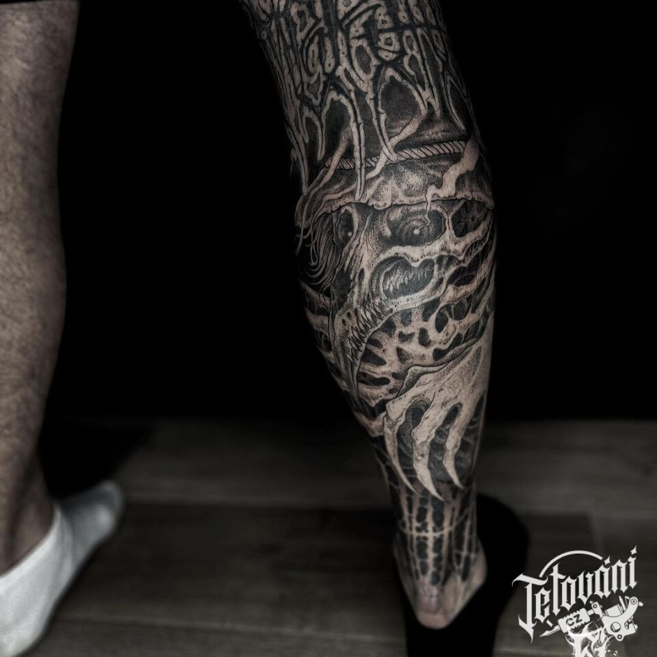 Tetování lebka a nápisy na lýtku