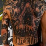 Tetování lebka a ornamenty, nápisy na záda