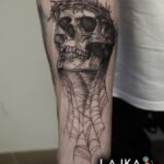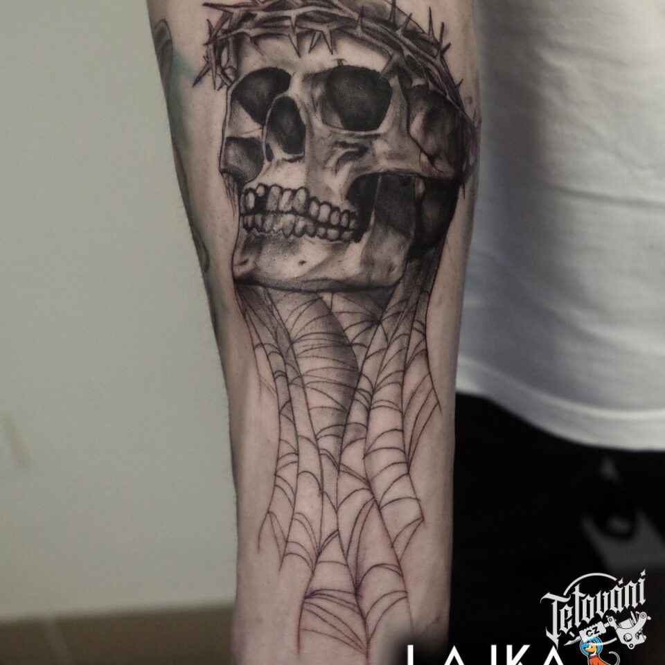 Tetování lebka a pavučina na předloktí