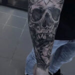 Tetování lebka a portrét ženy na předloktí