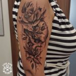 Tetování lebka a růže, květiny na rameno