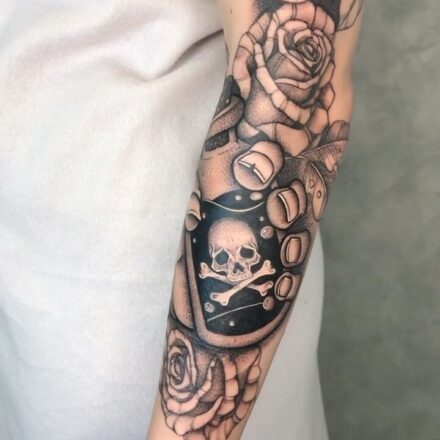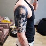 Tetování lebka a růže na rameni