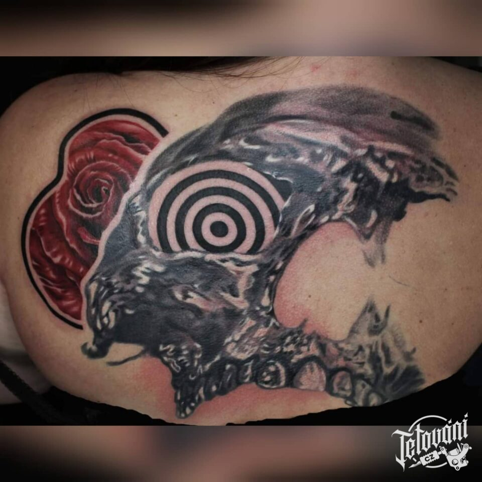 Tetování lebka a růže na zádech