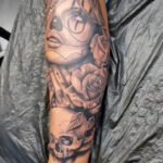 Tetování lebka a růže, ruce, portrét ženy na lýtku