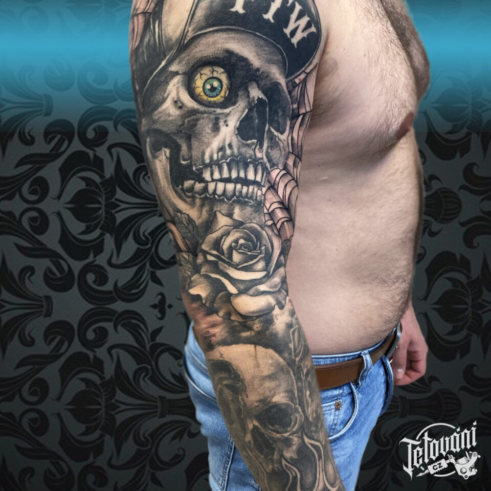 Tetování lebka a růže, rukáv