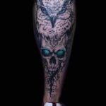 Tetování lebka a sova na lýtku