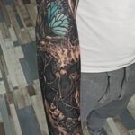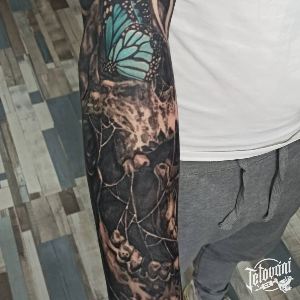 Tetování lebka a zvířata, motýl na rukávu