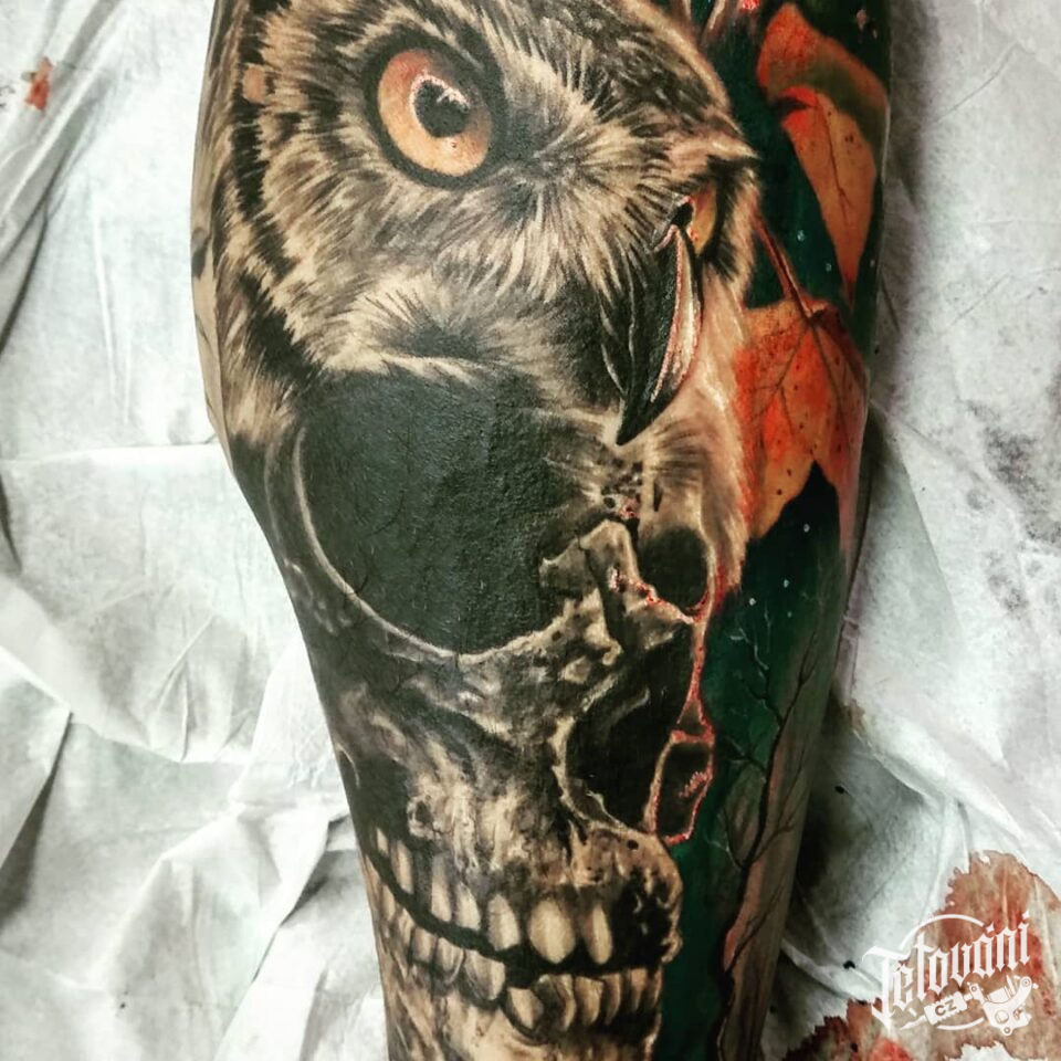 Tetování lebka a zvířata, ptáci, sova na předloktí