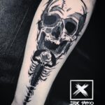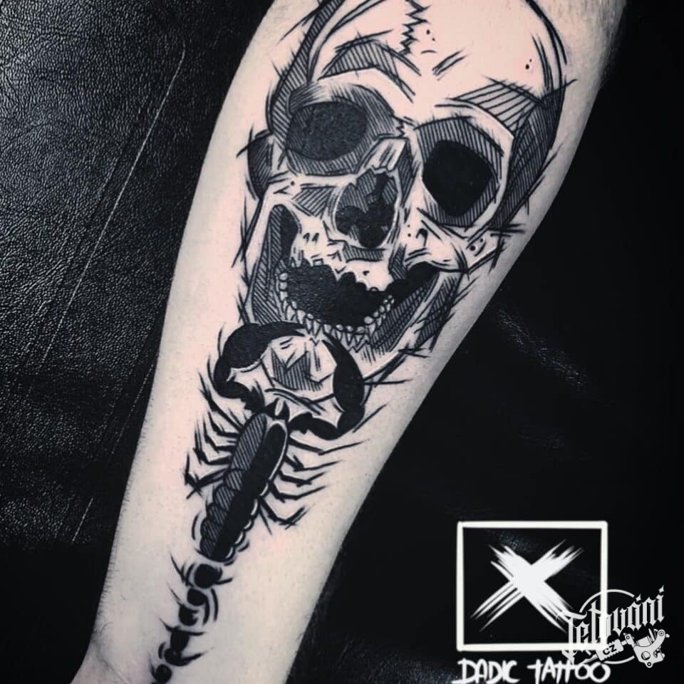 Tetování lebka a zvíře, škorpion, štír na předloktí