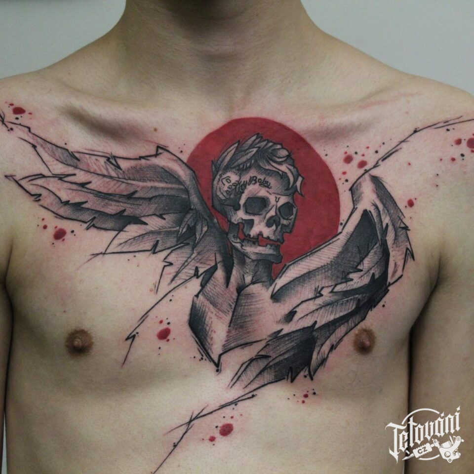 Tetování lebka anděl na hrudník