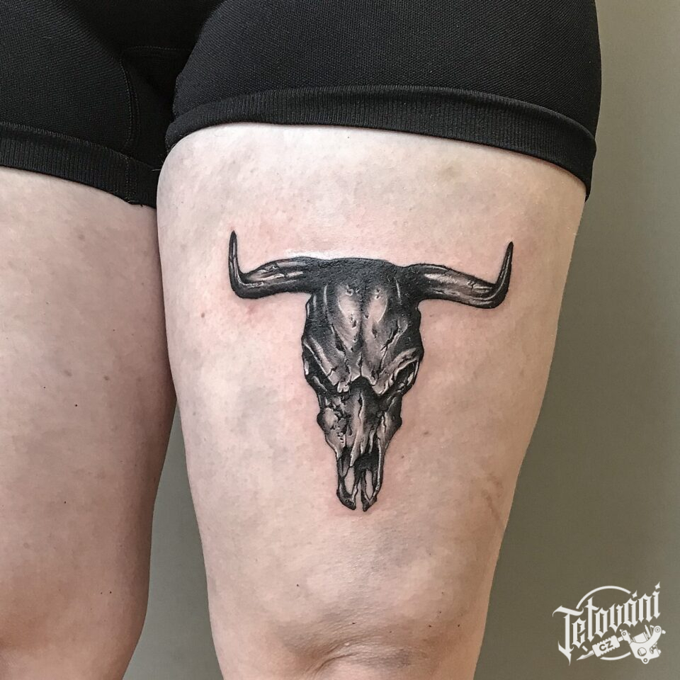Tetování lebka býka na stehně