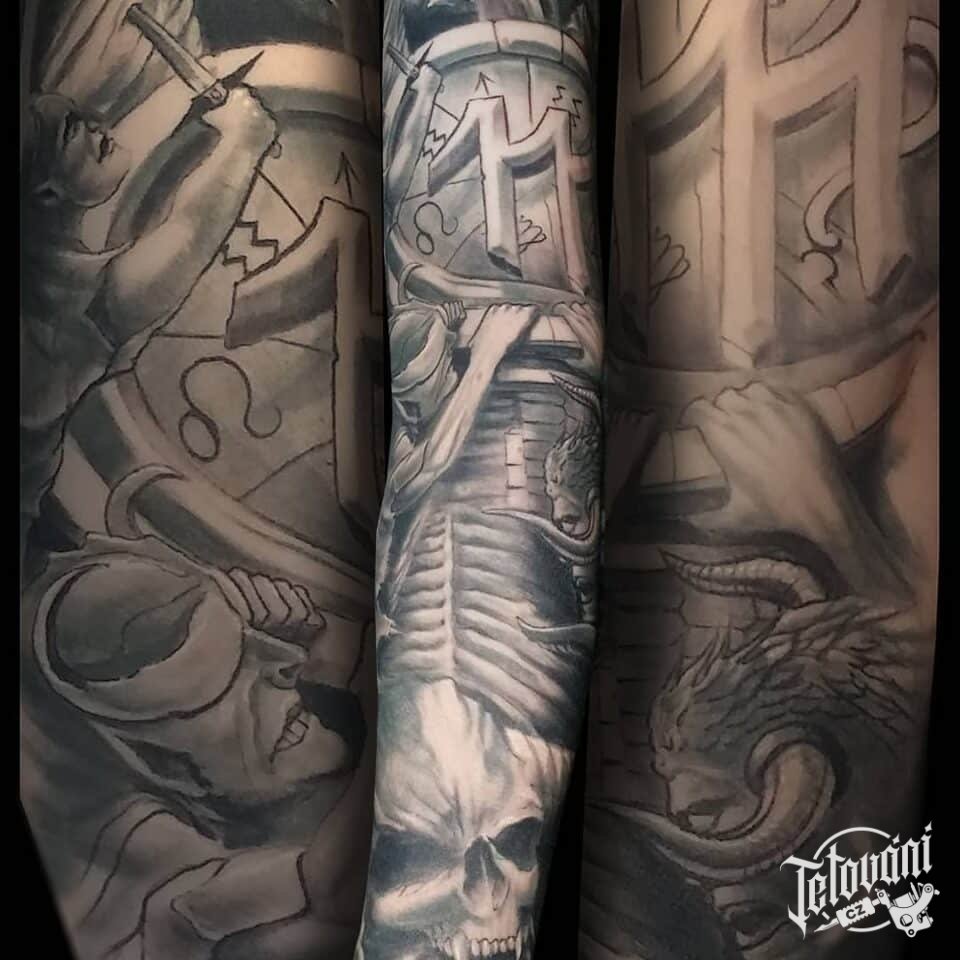 Tetování lebka, ďábel, štír znamení zvěrokruhu na ruce