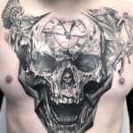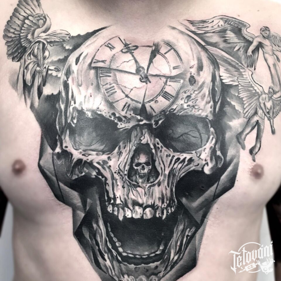 Tetování lebka, hodiny, andělé na hrudník