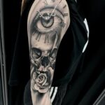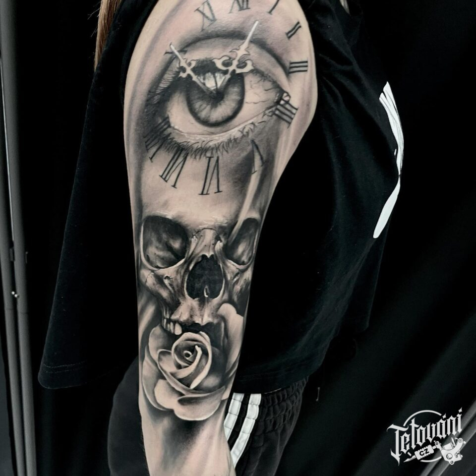 Tetování lebka, hodiny, květiny, růže a oko na rameni