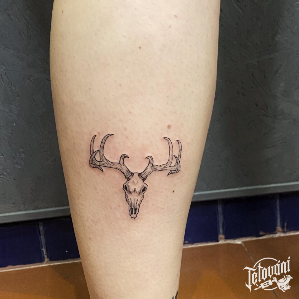 Tetování lebka jelena na lýtku