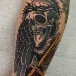 Tetování lebka, křídlo na lýtku