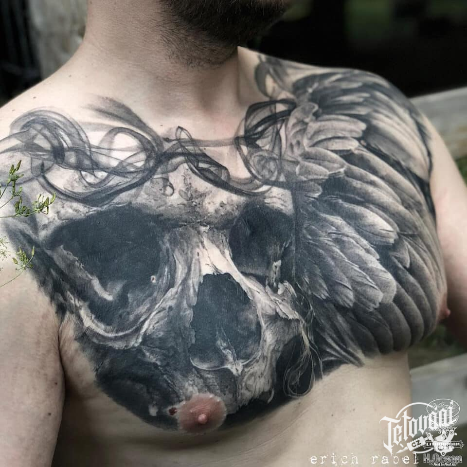 Tetování lebka, křídlo na prsou