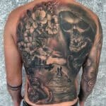Tetování lebka, květiny, sakura a příroda na zádech