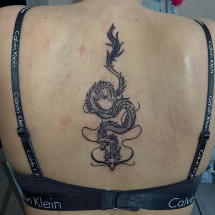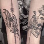 Tetování lebka, lebka a růže, mýtické bytosti, drak a šíp na předloktí