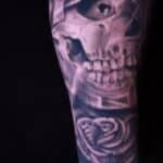 Tetování lebka, lebka a růže z peněz na předloktí
