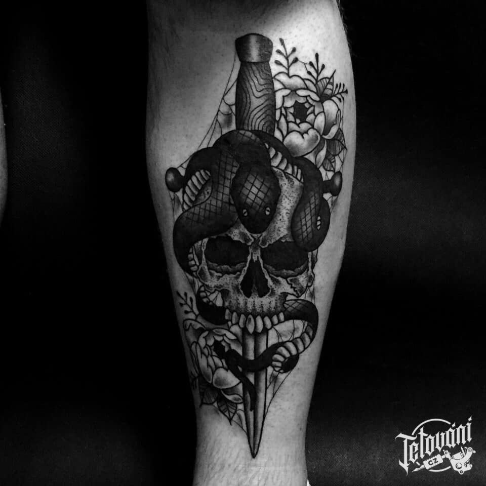 Tetování lebka, meč, květiny pivoňka na lýtko