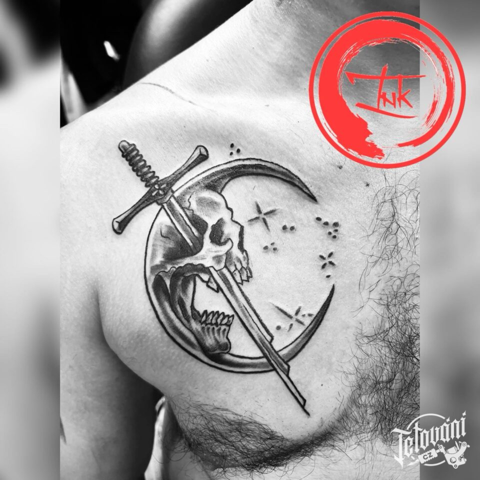 Tetování lebka, meč na prso