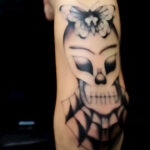 Tetování lebka, motýl a pavičina na paži