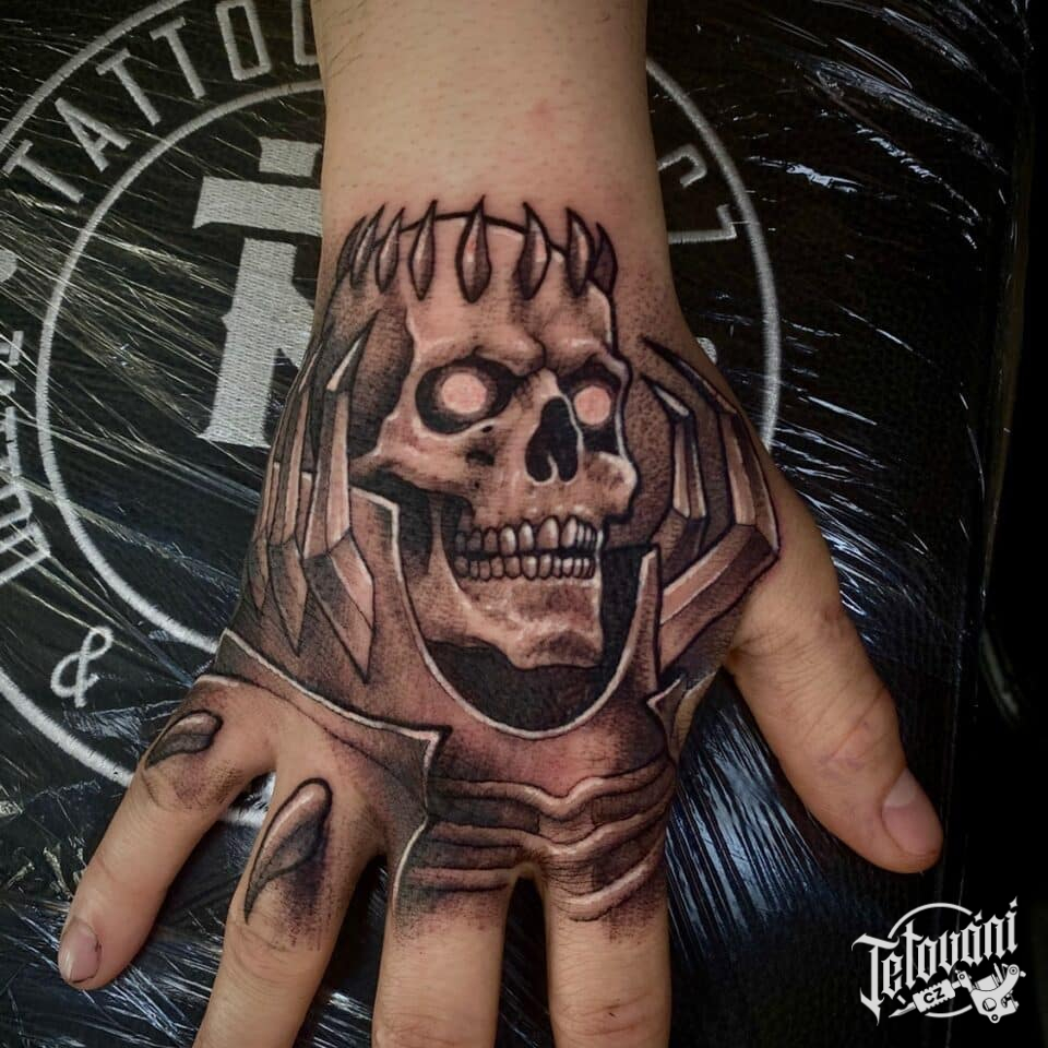 Tetování lebka na hřbetu ruky