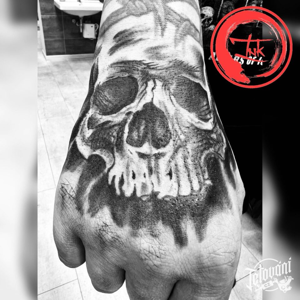Tetování lebka na hřbetu ruky