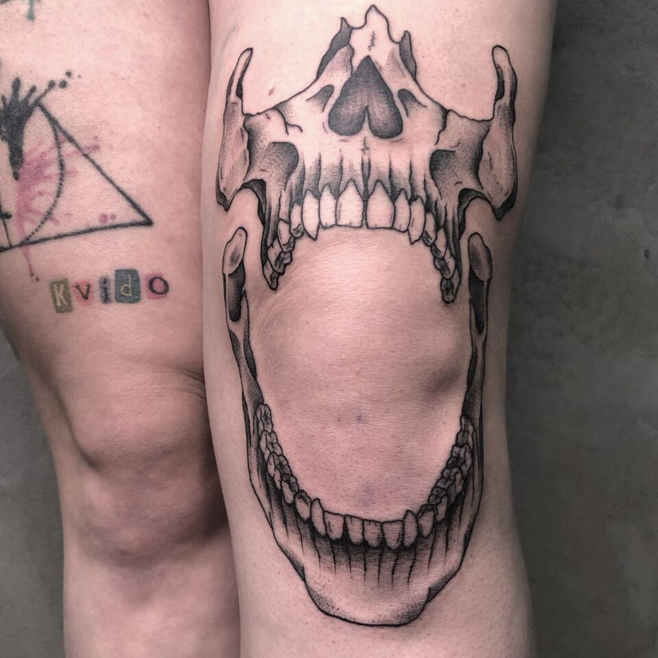 Tetování lebka na koleni